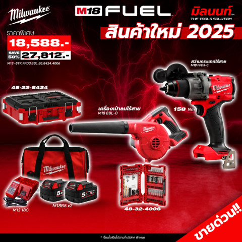 Milwaukee - อัศวินพร้อมลุยทุกงาน ชุดคอมโบสุดคุ้มสำหรับงานช่างมืออาชีพและสาย DIY ที่ต้องการ “พลัง+ความคล่องตัว” ในชุดเดียว ครบทั้ง สว่านกระแทกไร้สาย M18 FPD3-0 สำหรับเจาะ/ขัน/เจาะกระแทก และ เครื่องเป่าลมไร้สาย M18 BBL-0 สำหรับเป่าฝุ่น ทำความสะอาดพื้นที่ทำงานหรือเครื่องมือ พร้อมแบต 5.0Ah ถึง 2 ก้อน ชาร์จไว เก็บงานเป็นระเบียบด้วยกล่อง PACKOUT™ และชุดดอก 40 ชิ้น จบงานได้เร็วและมั่นใจในทุกไซต์งาน