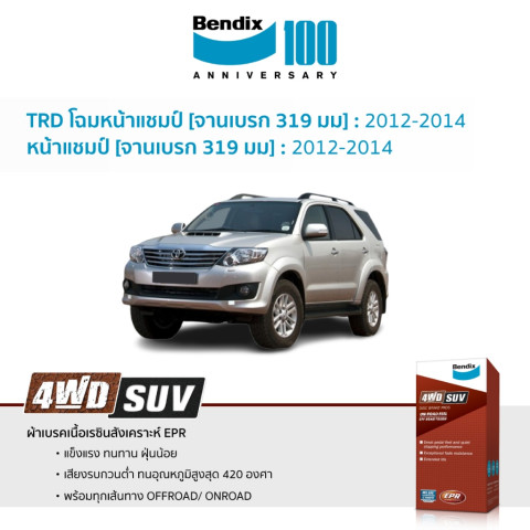 เพิ่มความมั่นใจทุกการเบรกด้วยผ้าเบรก Bendix สำหรับ Toyota Fortuner โฉมหน้าแชมป์/รุ่น TRD ที่ใช้ จานเบรก 319 มม ออกแบบมาให้รองรับการใช้งานจริงทั้งในเมืองและเดินทางไกล ให้การตอบสนองของแป้นเบรกที่มั่นคง เบรกได้หนึบ ควบคุมรถได้ดี ช่วยยกระดับความปลอดภัยในทุกเส้นทาง