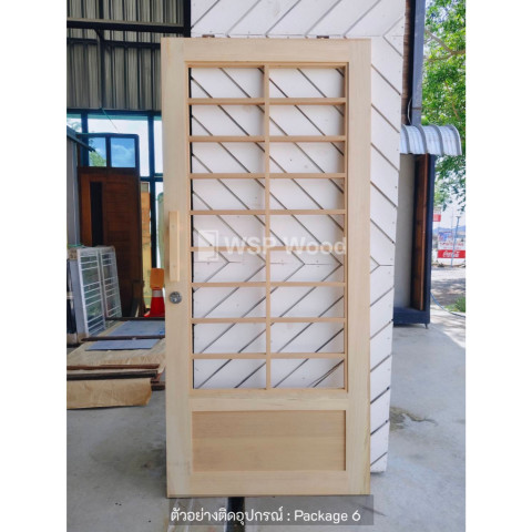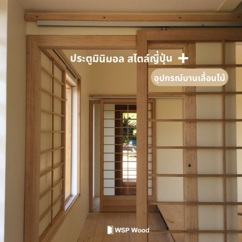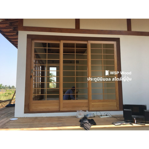 บานประตูกระจกไม้ระแนง แบ่ง 5 ส่วน ส่วนล่างเป็นลูกฟักโมเดิร์นเรียบ ส่วนบนเป็นระแนงไม้สไตล์ญี่ปุ่นร่วมสมัย