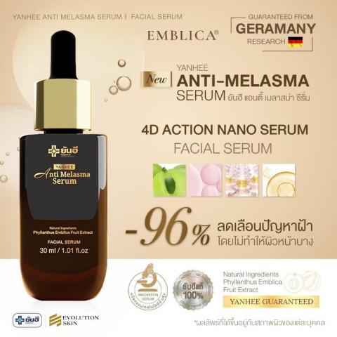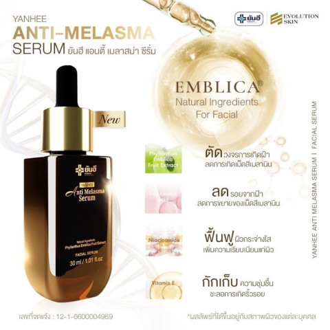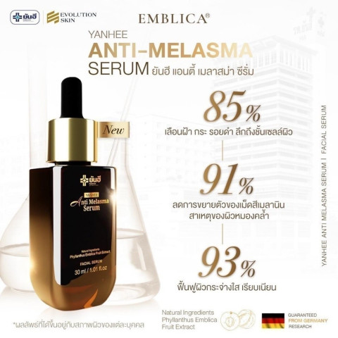 ยันฮี แอนตี้ เมลาสม่า ซีรั่ม (YANHEE ANTI MELASMA SERUM) เซรั่มบำรุงผิวหน้าจากสูตรเอกสิทธิ์โรงพยาบาลยันฮี พัฒนานานกว่า 2 ปี โดยทีมแพทย์ผู้เชี่ยวชาญ เพื่อแก้ปัญหาฝ้า กระ สำหรับคนไทยโดยเฉพาะ ด้วยเทคโนโลยีสารสกัดขั้นสูง ช่วยยับยั้งและลดการสร้างเม็ดสีเมลานิน พร้อมกระตุ้นคอลลาเจนใต้ผิว และผลัดเซลล์ผิวอย่างอ่อนโยน ไม่ทำให้ผิวบาง เหมาะแม้ผิวแพ้ง่าย