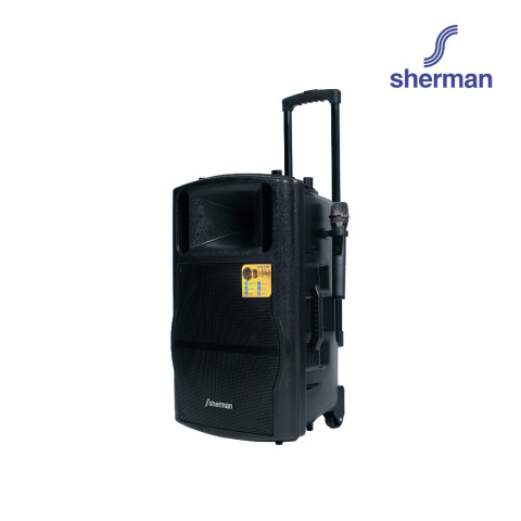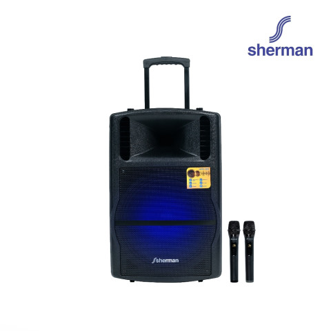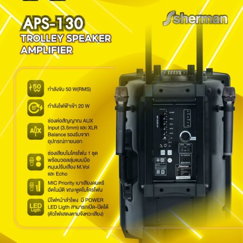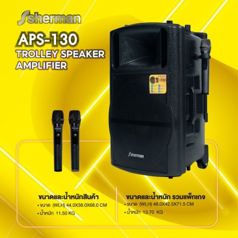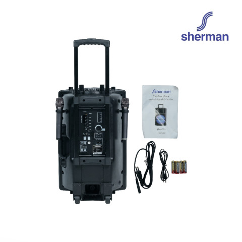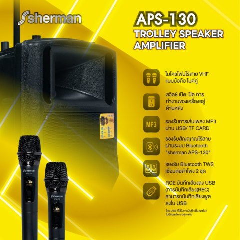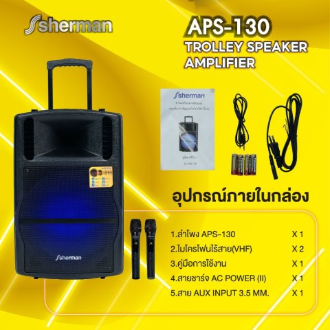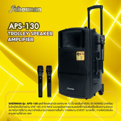 Sherman ชุดลำโพงอเนกประสงค์ ขนาด 15 นิ้ว (Bluetooth) รุ่น APS-130 ราคา 5,990.00 บาท คือคำตอบสำหรับงานพูด งานพรีเซนต์ และกิจกรรมขนาดเล็กที่ต้องการเสียงดังชัด ใช้งานง่าย และพกพาสะดวก ด้วยกำลังขับ 50W (RMS) มาพร้อม ไมโครโฟนไร้สาย VHF แบบมือถือ 2 ตัว และดีไซน์ ชุดล้อลาก + แบตเตอรี่ในตัว เหมาะสำหรับงานขายสินค้า, งาน Event ขนาดเล็ก, งานโปรโมชั่นนอกสถานที่ และคาราโอเกะได้ครบในเครื่องเดียว