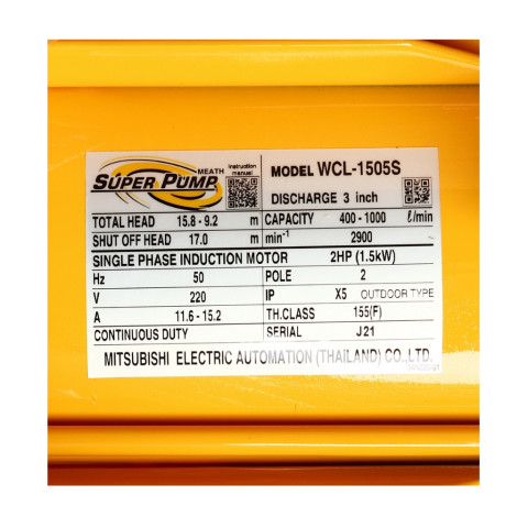 MITSUBISHI WCL1505S (Super Pump) ปั๊มน้ำหอยโข่งขนาด 3"x3" แบบเกลียว กำลัง 2HP (1.5kW) ใช้ไฟ 220V เหมาะสำหรับงานสูบน้ำปริมาณมาก “น้ำแรงจริง” ทั้งงานเกษตร ชลประทาน ระบบประปา งานหมุนเวียนน้ำ และงานโรงงานที่ต้องการอัตราการไหลสูงในระยะส่งไม่สูงมาก