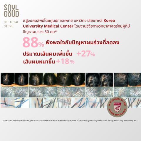 ได้รับการรองรับจาก ศูนย์การแพทย์ มหาวิทยาลัยเกาหลี (Korea University Medical Center) ในกลุ่มผู้มีปัญหาผมร่วงจำนวน 50 คน โดยการทดลองแบบสุ่ม ปกปิดสองฝ่าย และมีกลุ่มควบคุม