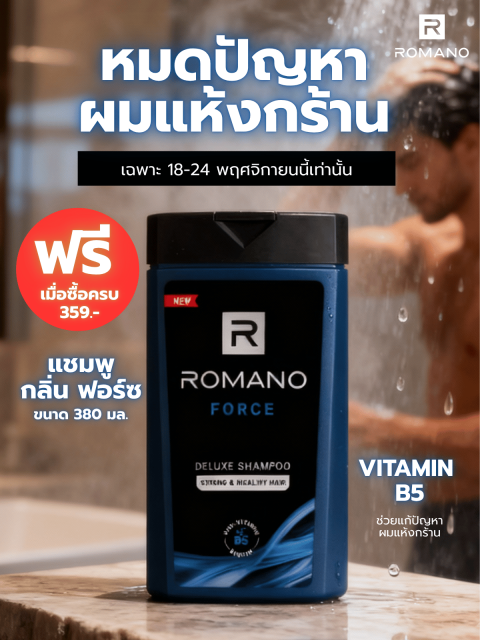 มอบลุคสดชื่น มั่นใจตลอดวันด้วย [ไม่ใช่สำหรับการขาย] แชมพูโรมาโน่ กลิ่น ฟอร์ซ 380 มล. แชมพูสำหรับผู้ชายสไตล์พรีเมียมจาก ROMANO Deluxe ที่ออกแบบมาเพื่อดูแลเส้นผมและหนังศีรษะ พร้อมกลิ่นหอมมีเอกลักษณ์ในแบบผู้ชายยุคใหม่