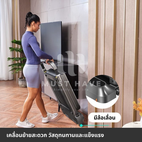 โครงสร้างพับได้ ช่วยลดพื้นที่จัดเก็บ เหมาะกับห้องขนาดจำกัด และเคลื่อนย้ายสะดวกด้วยล้อใต้เครื่องเดินหรือวิ่งได้ในเครื่องเดียว