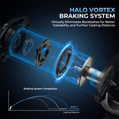 ผนังกระบอกบางเฉียบเพียง 0.35 มม. น้ำหนักกระบอกประมาณ 6.9 กรัม ลดแรงเฉื่อยอย่างเห็นได้ชัด ช่วยให้ปล่อยเหยื่อได้ลื่นและควบคุมง่าย รองรับน้ำหนักเหยื่อกว้างตั้งแต่ 1.7–30 กรัม พร้อมความแข็งและความทนการสึกหรอสูง เหมาะกับการใช้งานจริงจังระยะยาวAdvanced Halo Vortex Braking System คุมหลังบ้านอยู่หมัด