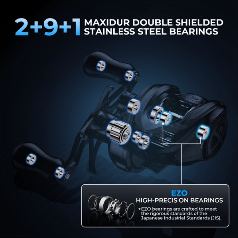 ตลับลูกปืน MaxiDur แบบหุ้มสองชั้น 9+1 ผสานตลับลูกปืนความแม่นยำสูง EZO ช่วยให้ทั้งการหล่อและการเก็บสายเนียนมือ เกียร์ UltraDura90 (ทองเหลือง) + Aerospace T6 (อลูมิเนียม) ให้ความแข็งแรงและความเสถียรในการใช้งานจับสบายทั้งวัน ปรับง่ายด้วยมือเดียว