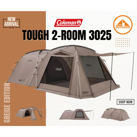 Coleman Tough 2 Room/3025 #Greige (NEW 2025) เต็นท์ 2 ห้องรุ่นยอดนิยมจาก Coleman Japan โทนสีใหม่ “Greige” สวยละมุน เข้ากับทุกแคมป์ พื้นที่กว้างขวางแบบ 2 โซนแยกชัดเจน เหมาะสำหรับทริปครอบครัวหรือกลุ่มเพื่อน 4-5 คน ได้อย่างสบาย ทั้งนั่งทำกิจกรรมและพักผ่อนในเต็นท์เดียวจบ