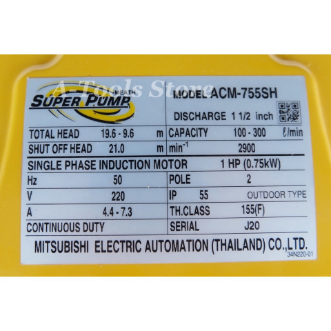 MITSUBISHI SUPER PUMP รุ่น ACM-755SH ปั๊มน้ำหอยโข่ง (Medium Head Centrifugal Pump) ขนาดท่อ 1.5" x 1.5" กำลัง 1 แรงม้า (0.75 kW) ใช้ไฟ 220V เหมาะสำหรับงานที่ต้องการทั้ง “ปริมาณน้ำดี” และ “แรงดันสม่ำเสมอ” ไม่ว่าจะเป็นงานบ้าน งานสวน งานเกษตร ไปจนถึงงานอุตสาหกรรม พร้อมมาตรฐานการป้องกันสำหรับการใช้งานต่อเนื่องและกลางแจ้ง