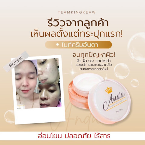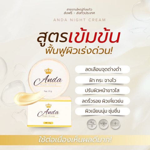 เรทสต๊อกครีมอันดาไนท์ครีม (Anda Night Cream) ครีมบำรุงผิวสูตรเข้มข้นสำหรับดูแลปัญหาผิวกวนใจแบบครบจบในกระปุกเดียว ช่วยดูแล ฝ้า กระ จุดด่างดำ รอยสิว ความหมองคล้ำ พร้อมบำรุงให้ผิวดูกระจ่างใสและเรียบเนียนอย่างเป็นธรรมชาติ เหมาะสำหรับ ทุกเพศ