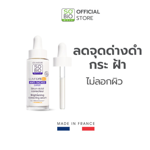 SO'BiO etic Lumilys C Brightening Correcting Serum Anti-dark spot เซรั่มออร์แกนิคเข้มข้นสำหรับดูแลปัญหา จุดด่างดำ ฝ้า กระ จากทุกสาเหตุ ช่วยให้ผิวดู สว่าง กระจ่างใส และสีผิวสม่ำเสมอ โดยให้ผลลัพธ์แบบอ่อนโยน ไม่ลอกผิว และไม่รุนแรงต่อผิว เหมาะสำหรับผู้ที่ต้องการลดเลือนรอยดำเฉพาะจุด พร้อมฟื้นคืนความใสให้ผิวในทุกวัน