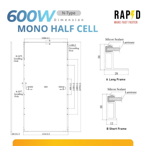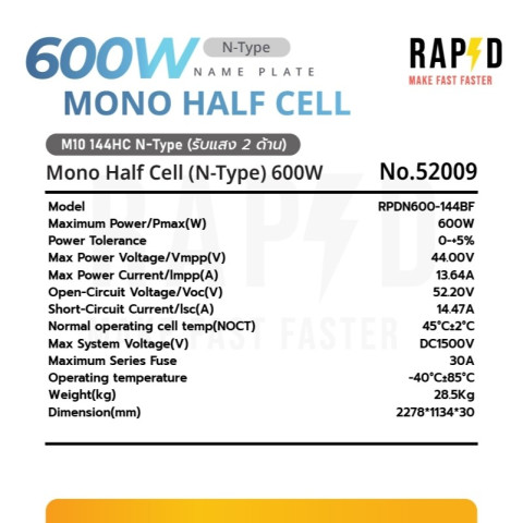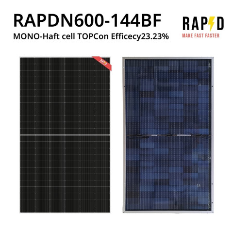 ส่งพลังงานสะอาดให้บ้านและธุรกิจของคุณด้วยชุดแผงโซล่าเซลล์คุณภาพสูง RAPD โปรชุดแผงโซล่าเซลล์ 600W Mono Half Cell BF (N-Type) ชนิดรับแสง 2 ด้าน (Bifacial) มาพร้อมเทคโนโลยีเซลล์ N-Type รุ่นใหม่ ประสิทธิภาพสูง ทนทาน อายุการใช้งานยาวนาน และยังรับประกันแผงยาวถึง 12 ปี ช่วยให้คุณผลิตไฟฟ้าได้อย่างคุ้มค่า ประหยัดค่าไฟในระยะยาว เหมาะสำหรับติดตั้งบนหลังคาบ้าน อาคาร โรงงาน หรือฟาร์มโซลาร์ที่ต้องการกำลังผลิตสูงในพื้นที่จำกัด