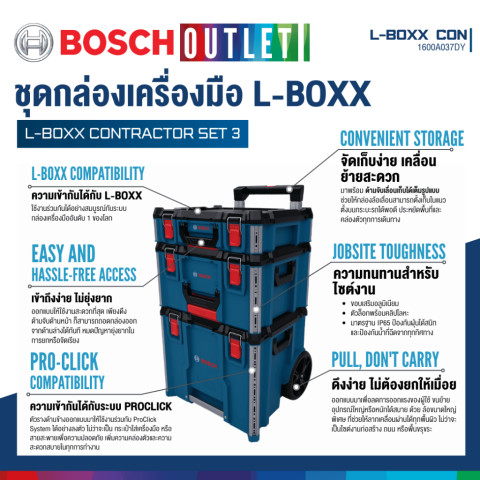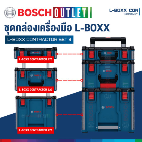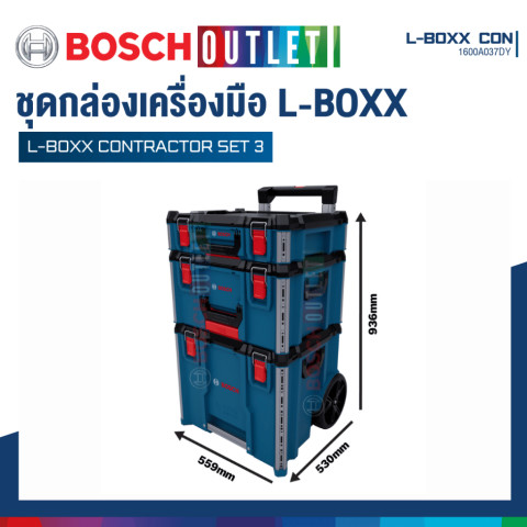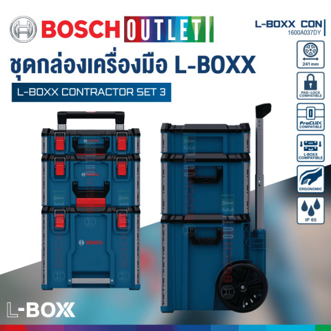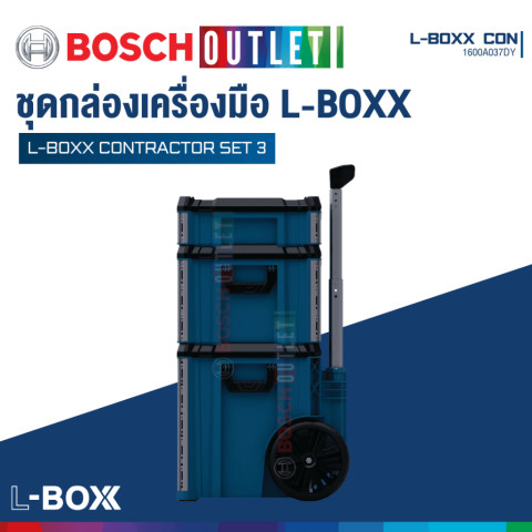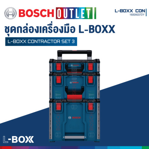 BOSCH L-BOXX Contractor Set 3 ชุดกล่องเครื่องมือเคลื่อนย้ายสะดวก รุ่น #1600A037DY ราคา 9,860.00 บาท ออกแบบมาเพื่อช่างมืออาชีพที่ต้องการทั้งความทนทาน การจัดระเบียบที่ยืดหยุ่น และการขนย้ายที่คล่องตัวในงานหน้างานจริง ระบบกล่องสามารถ ล็อคซ้อนและเชื่อมต่อกันได้ ตามต้องการ รองรับการใช้งานร่วมกับอุปกรณ์ในตระกูล L-BOXX ได้หลากหลาย ช่วยให้เก็บและพกเครื่องมือ/อุปกรณ์เสริมได้เป็นระเบียบ พร้อมปกป้องจากสภาพแวดล้อมที่เสี่ยงต่อความเสียหาย