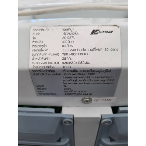 เย็นทั่วถึง คลายร้อนสบายทั้งวันด้วย พัดลมไอเย็น ลดราคาพิเศษ Astina รุ่น AC027A ถังบรรจุน้ำ 80 ลิตร สินค้าใหม่สภาพโชว์จากห้าง (90-98%) ผ่านการตรวจเช็กและทดสอบการใช้งานครบทุกฟังก์ชัน มั่นใจได้ในประสิทธิภาพ พร้อมรับประกันการใช้งาน 3 เดือน ในราคาสุดคุ้มเพียง 12,500 บาท เหมาะสำหรับบ้านพักอาศัย ออฟฟิศ ร้านค้า หรือพื้นที่ขนาดกลาง–ใหญ่ที่ต้องการความเย็นสบายต่อเนื่องตลอดวัน
