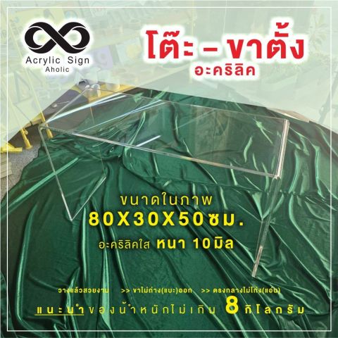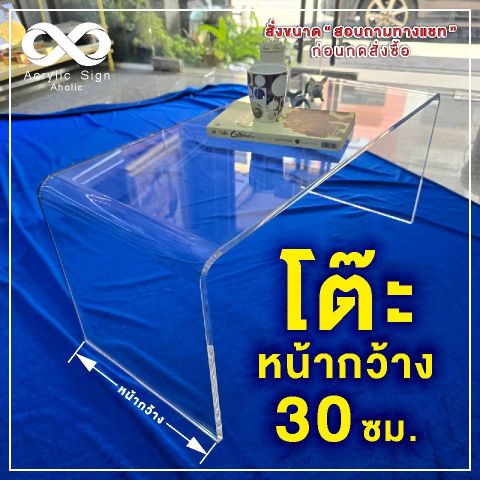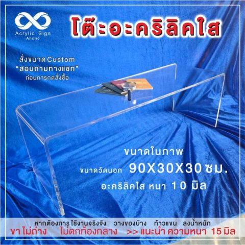 มีสเปคตัวอย่าง 120 × 30 × 60 ซม. อะคริลิคใสหนา 12 มม. เหมาะเป็นโต๊ะกลาง โต๊ะโชว์ หรือโต๊ะวางของตกแต่ง