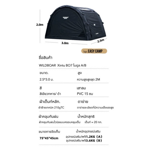 XINTU รุ่น Wildbor B07 เต็นท์เสาลมทรงใหม่ผ้า TC ขนาด 3 x 2.5 x 2 เมตร รุ่น B สีดำ คือเต็นท์แคมป์ปิ้งสไตล์โมดูลาร์ที่ออกแบบมาเพื่อสายแคมป์ยุคใหม่ที่ต้องการทั้งความสะดวกสบายและดีไซน์ทันสมัย โดยสามารถเลือกใช้งานแยกเป็นโมดูล หรือเชื่อมต่อกันเพื่อเพิ่มพื้นที่ใช้สอยได้ตามต้องการ