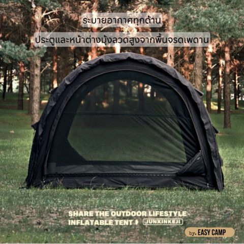 เต็นท์รุ่นนี้ใช้โครงเสาลม PVC ขนาดใหญ่ 15 ซม. แข็งแรง ติดตั้งง่าย เพียงใช้ที่สูบลมที่มีมาให้ในชุดก็สามารถกางเต็นท์ได้อย่างรวดเร็ว ไม่ต้องยุ่งยากกับเสาเต็นท์แบบเดิม ตัวผ้าเต็นท์ทำจากผ้า TC คุณภาพดี ช่วยระบายอากาศได้ดีเยี่ยม ให้สัมผัสโปร่งสบาย ไม่อับชื้น และยังมีความทนทาน เหมาะกับการแคมป์ปิ้งทั้งแบบทริปสั้นและทริปยาว