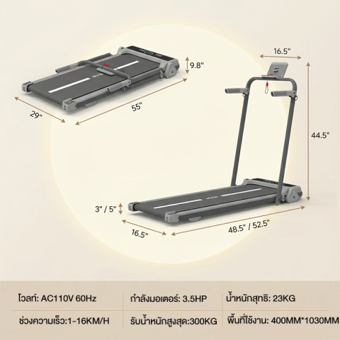 โครงสร้างลู่วิ่งออกแบบให้เหมาะกับพื้นที่ภายในบ้านโดยเฉพาะ ราวจับด้านข้างสามารถพับเก็บได้ ช่วยประหยัดพื้นที่เมื่อไม่ได้ใช้งานพับเก็บชิดผนังได้ เคลื่อนย้ายสะดวก