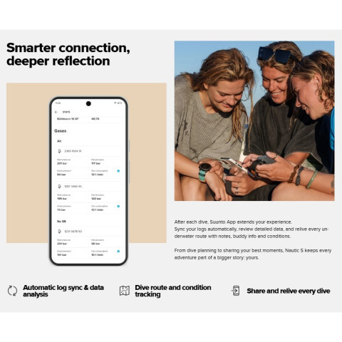 นอกจากนี้ SUUNTO - Nautic S ยังสามารถเชื่อมต่อ Tank Pod แบบไร้สาย (อุปกรณ์เสริม) เพื่อแสดงข้อมูลลมคงเหลือในถังดำน้ำ เพิ่มระดับความปลอดภัยในการดำน้ำของคุณไปอีกขั้น พร้อม GPS ในตัว สำหรับบันทึกจุดขึ้น-ลงน้ำ และตำแหน่งจุดดำน้ำอย่างแม่นยำ เมื่อดำน้ำเสร็จสามารถเชื่อมต่อกับ Suunto App เพื่อ Sync Logbook ดู Dive Profile และอัปเดตเฟิร์มแวร์ได้สะดวกผ่านสมาร์ตโฟน