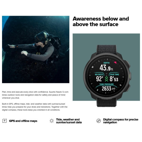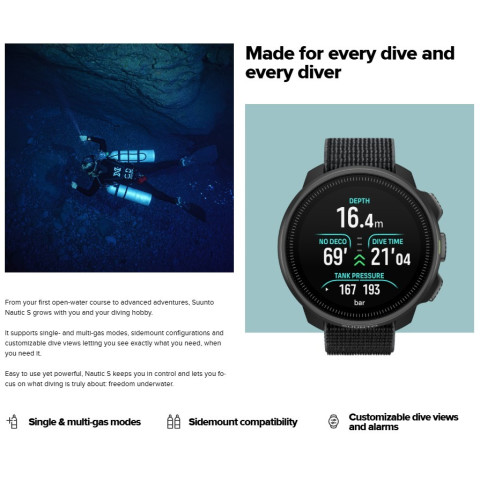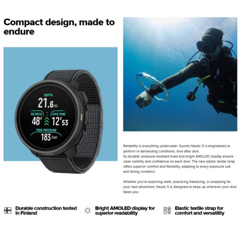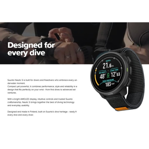หากคุณกำลังมองหา Dive Computer ที่ทั้ง ปลอดภัย เชื่อถือได้ ฟังก์ชันครบ ดีไซน์สวย ใส่ได้ทุกวัน SUUNTO - Nautic S คือคำตอบที่ลงตัว ทั้งสำหรับนักดำน้ำที่เพิ่งเริ่มต้น และผู้ที่ต้องการอัปเกรดจากคอมดำน้ำรุ่นพื้นฐาน ไปสู่รุ่นที่รองรับการใช้งานในระยะยาว