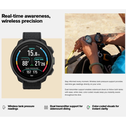 รองรับการดำน้ำทั้งแบบ Single & Multi-Gas ใช้งานได้กับ Air, Nitrox และ Multi-Gas รวมถึงการดำน้ำแบบ Sidemount ทำให้เหมาะทั้งสำหรับนักดำน้ำสันทนาการ และ Advanced Divers ที่ต้องการอิสระในการวางแผนการดำน้ำมากขึ้น เมนูถูกออกแบบมาให้ใช้งานง่าย เข้าถึงข้อมูลสำคัญได้รวดเร็ว ตัวเลขอ่านชัดเจน ช่วยให้คุณโฟกัสกับประสบการณ์ใต้น้ำได้เต็มที่