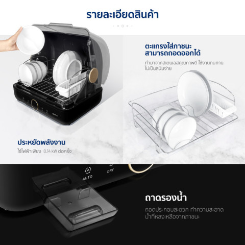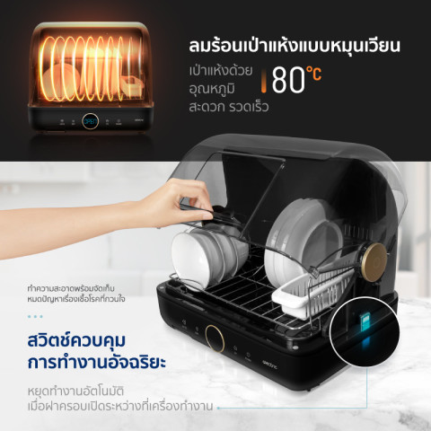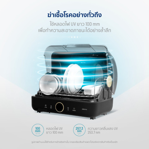 มาพร้อมเทคโนโลยีอบแห้งด้วยลมร้อนผสานรังสี UV อุณหภูมิสูงถึง 70–80°C ช่วยฆ่าเชื้อโรคและแบคทีเรียได้อย่างมีประสิทธิภาพสูงถึง 90% ภายในเครื่องออกแบบให้มีขนาดกะทัดรัดแต่จุของได้เยอะ รองรับการใช้งานสำหรับ 1–4 คน ใส่ได้ทั้งจาน ชาม ช้อนส้อม ขวดนม กล่องอาหาร และอุปกรณ์ครัวที่ทนอุณหภูมิสูงกว่า 80°C