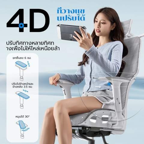 จุดเด่น: แขนเฉียงอิสระ นั่งสบาย รองรับการทำงานนาน ๆ