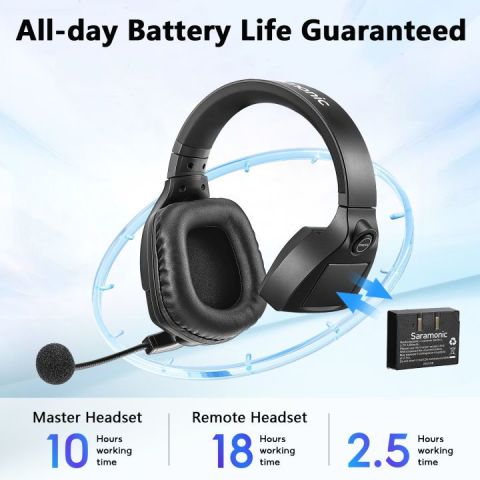 ใช้งานได้นานสูงสุดประมาณ 18 ชั่วโมง (ชุดหูฟังรีโมท) และ 5 ชั่วโมง (ชุดหูฟังมาสเตอร์ เมื่อใช้งานร่วมกับรีโมท 4 ตัว) พร้อม แท่นชาร์จ 10 ช่อง ช่วยจัดการแบตให้พร้อมใช้งานรวดเร็ว และมี พอร์ต USB-C สำหรับจ่ายไฟ/ชาร์จระหว่างใช้งานผ่านพาวเวอร์แบงก์หรืออะแดปเตอร์ได้ขยายระบบได้ถึง 17 คน