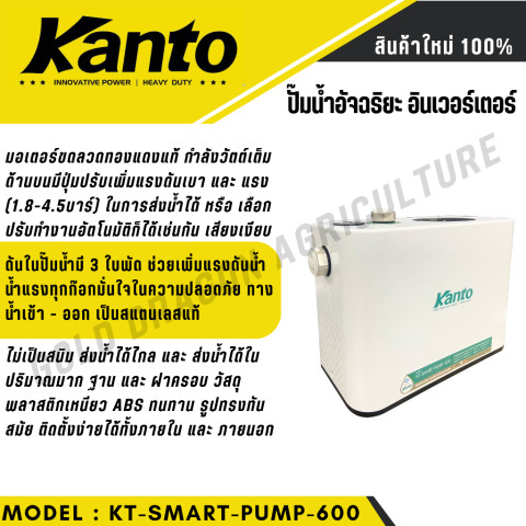 ปั๊มน้ำ ระบบอินเวอร์เตอร์ KANTO Smart Water Pump รุ่น KT-SMART-PUMP-600 ราคา 6,048.00 บาท เติมแรงดันน้ำให้สม่ำเสมอทุกก๊อกด้วยเทคโนโลยีอินเวอร์เตอร์ที่ช่วยควบคุมการทำงานอย่างชาญฉลาด ปรับแรงดันได้ตามต้องการ เสียงเงียบ ใช้งานง่าย เหมาะสำหรับบ้านพักอาศัยที่ต้องการน้ำแรงคงที่ตลอดวัน