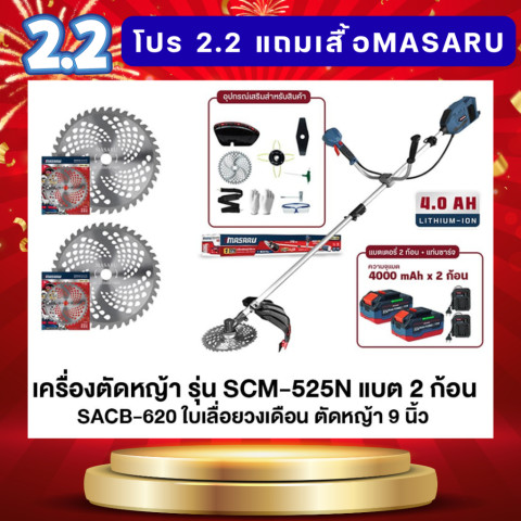 COMBO SET MASARU เครื่องตัดหญ้าไร้สาย รุ่น SCM-525 ครบชุดพร้อมลุยงานสวนแบบมือโปร มาพร้อม แบตเตอรี่ 2 ก้อน + แท่นชาร์จ 2 อัน + ใบตัดหญ้า 2 ใบ ตัดเร็ว แรง และนิ่ง ด้วย มอเตอร์ไร้แปรงถ่าน (Brushless) ใช้งานได้นานขึ้น ดูแลง่าย เหมาะทั้งสนามหญ้าบ้านพักอาศัย สวนขนาดเล็ก–กลาง ไปจนถึงพื้นที่หญ้าหนา/พุ่มหนา ปรับกำลังได้ 3 ระดับให้เหมาะกับหน้างาน