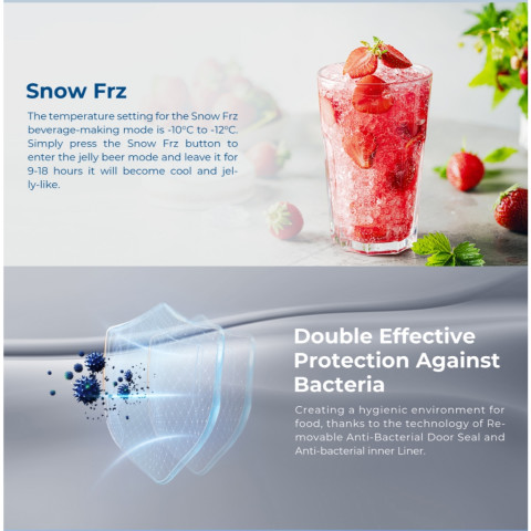 ตั้งอุณหภูมิแนะนำ -10 ถึง -12°C แล้วกดปุ่ม Snow Frz. เพื่อเข้าโหมดเบียร์วุ้น แช่ต่อเนื่องประมาณ 9–18 ชั่วโมง เครื่องดื่มจะเย็นเป็นวุ้น พร้อมเสิร์ฟความฟินแบบร้านดังที่บ้านช่วงอุณหภูมิกว้าง ใช้งานได้หลากหลาย