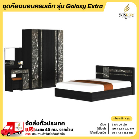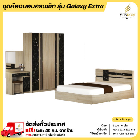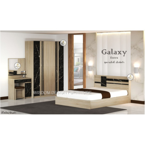 ชุดห้องนอน Galaxy Extra ครบเซ็ตพร้อมจัดห้องให้สวยเท่ โทน โอ๊ค/หินดำ ดูพรีเมียมเข้ากับบ้านหลายสไตล์ มาพร้อมเฟอร์นิเจอร์ชิ้นหลักที่ใช้งานได้จริง ทั้งเตียง ตู้เสื้อผ้า และโต๊ะแป้ง ขนาดลงตัว เหมาะสำหรับห้องนอนที่ต้องการความเป็นระเบียบและบรรยากาศน่านอน