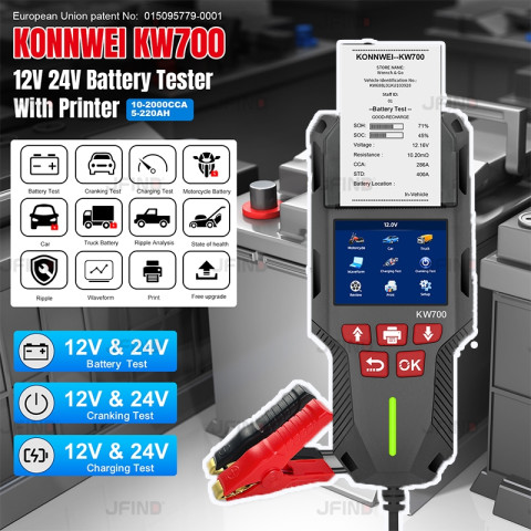 KONNWEI KW700 เครื่องทดสอบแบตเตอรี่ระดับมืออาชีพสำหรับรถยนต์ รถจักรยานยนต์ และรถบรรทุก รองรับทั้งระบบ 12V และ 24V พร้อม ฟังก์ชั่นพิมพ์ผลทดสอบ เพื่อเก็บบันทึกหรือส่งต่อให้ช่าง/ศูนย์บริการได้ทันที ช่วยตรวจเช็กสภาพแบตเตอรี่ได้รวดเร็ว แม่นยำ รู้ผลชัดเจนว่าควรชาร์จต่อ ใช้งานต่อ หรือถึงเวลาต้องเปลี่ยนแบตแล้ว