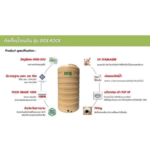 ถังเก็บน้ำคุณภาพระดับมาตรฐานโลกจาก DOS รุ่น ROCK โดดเด่นด้วยความแข็งแรง ทนทาน และยืดหยุ่นสูงด้วยนวัตกรรม DURAFLEX วัสดุ Food Grade 100% ปลอดภัยสำหรับการกักเก็บน้ำใช้ภายในบ้าน พร้อมคุณสมบัติ ทึบแสง กันตะไคร่น้ำ 100% และป้องกันรังสี UV ระดับ 8 สีไม่ซีดจาง ใช้งานคุ้มค่า อยู่คู่บ้านได้ยาวนาน พร้อม เกลียวทองเหลือง (Brass Fitting) แข็งแรง ไม่เป็นสนิม และ แถมลูกลอยดอส (ตามสเปคที่กำหนด)
