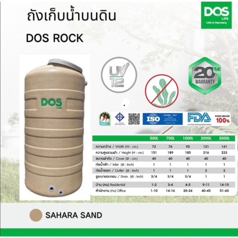 NEW! ถังเก็บน้ำ DOS ROCK ทึบแสง กันตะไคร่น้ำ แถมลูกลอยดอส รับประกัน 20 ปี (เกลียวทองเหลือง)