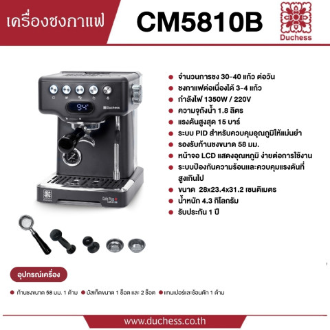 Duchess CM5810B เครื่องชงกาแฟระบบอัตโนมัติ (หัวชง 58 มม. แรงดัน 15 บาร์) เครื่องชงกาแฟรุ่นล่าสุดสำหรับ Home use ระดับกึ่ง Professional ที่ให้ช็อตเอสเปรสโซเข้มข้น กลิ่นหอม และครีมาสวยในงบคุ้มค่า เหมาะทั้งชงดื่มเองที่บ้าน หรือใช้เป็นเครื่องหลักสำหรับร้านขนาดเล็กที่ต้องการความเสถียรและใช้งานง่าย