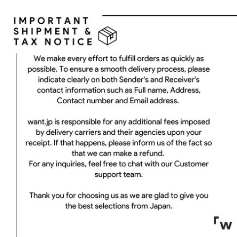 ภาษี/ค่าใช้จ่ายเพิ่มเติม: want.jp รับผิดชอบค่าใช้จ่ายเพิ่มเติมที่อาจเกิดขึ้นเมื่อคุณได้รับสินค้า หากผู้ให้บริการจัดส่งเรียกเก็บเงิน กรุณาติดต่อเราได้ทันที