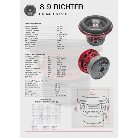 8.9ริกเตอร์ 864EX MARK II ซับวูฟเฟอร์ 8 นิ้ว รุ่นอัปเกรด BT849 EXTREME ให้เบสลึก แน่น กระแทกชัด เหมาะทั้งงานอัปเกรดเครื่องเสียงรถยนต์และชุดซับตู้ที่ต้องการพลังขับจริงจัง ด้วยว้อยซ์คู่ (Dual Voice Coil) รองรับกำลังขับรวมสูงถึง 600W RMS (300W + 300W) ตอบโจทย์การจูนเสียงได้ยืดหยุ่นมากขึ้น พร้อม รับประกันโรงงาน 3 ปี และ พร้อมส่ง ในราคา 5,790.00 บาท