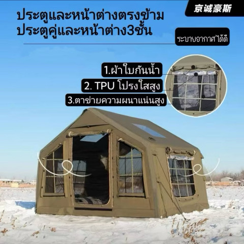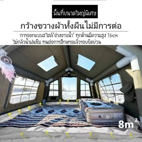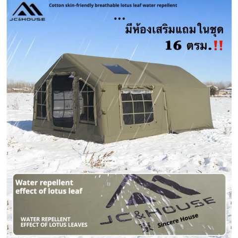 JC & House Air Tent 8+8 (16 ตร.ม.) เต็นท์เสาลม รุ่นอัพเกรด พร้อมแถมฟรี Rain Cover (ใช้เป็น Tarp หน้าเต็นท์ได้) มอบพื้นที่กว้างแบบ “2 ห้องเชื่อมต่อ” ตอบโจทย์ครอบครัว/แก๊งแคมป์ที่ต้องการความสบาย กางง่าย และระบายอากาศดีด้วยตาข่ายกันแมลงรอบทิศ พร้อมการรับประกันยาวนาน 5 ปี ของแท้ 100%
