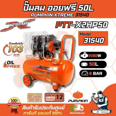 PUMPKIN ปั๊มลมออยฟรี 50 ลิตร รุ่น 31540 / PTT-X2HP50 X-TREME ปั๊มลมเสียงเงียบ เดินเครื่องนุ่ม สั่นสะเทือนต่ำ ให้ลมสะอาดปราศจากน้ำมัน เหมาะทั้งงานช่าง งานบ้าน ไปจนถึงพื้นที่ที่ต้องการความเงียบหรือมีข้อกำหนดด้านเสียง พร้อมรับประกัน 12 เดือน และ ส่งเร็ว ของแท้ 100% ในราคา 6,288.00 บาท