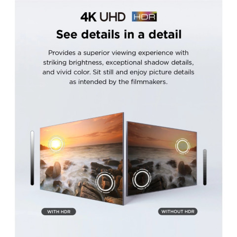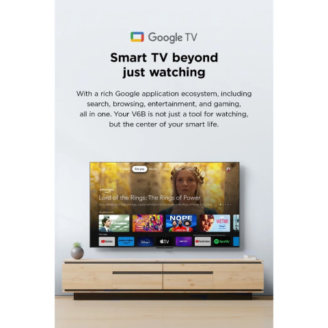 หน้าจอแบบ Infinity View อัตราส่วนหน้าจอสูงถึง 97% ให้มุมมองกว้าง เต็มตา รองรับ HDR10 และรีเฟรชเรต 60Hz ภาพลื่นไหล เหมาะทั้งดูหนัง ซีรีส์ และคอนเทนต์ออนไลน์ระบบ Android TV แท้ ใช้งานง่าย