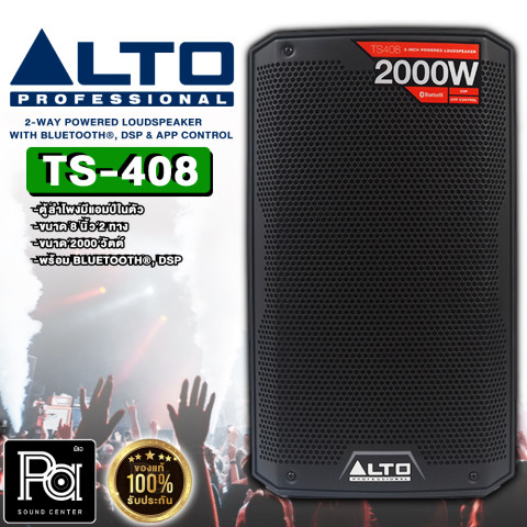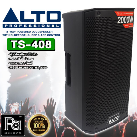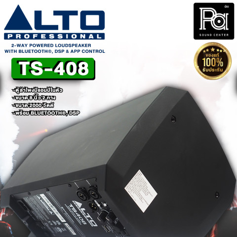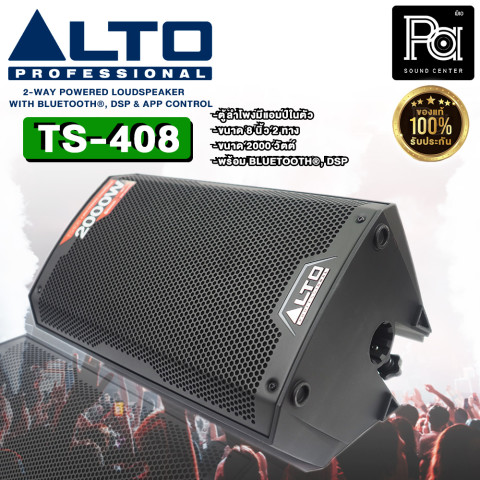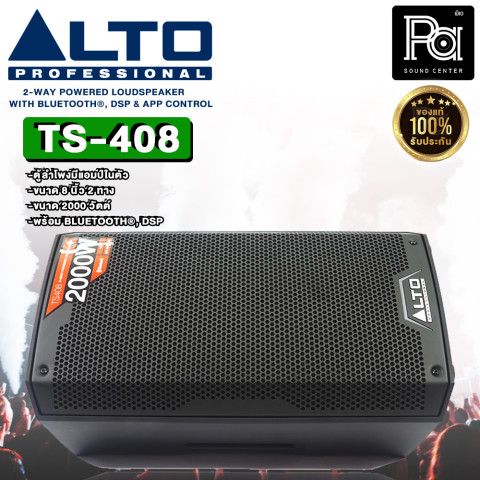 ALTO TS408 2000W 8" 2-Way Powered Loudspeaker ตู้ลำโพงมีแอมป์ในตัวขนาด 8 นิ้ว จาก PA SOUND CENTER ให้พลังเสียงดัง ชัด และควบคุมง่าย เหมาะทั้งงานไลฟ์ งานอีเวนต์ ห้องซ้อม เวทีขนาดกลาง ไปจนถึงใช้งานเป็นมอนิเตอร์บนเวที มาพร้อม Bluetooth®, DSP และรองรับการควบคุมผ่านแอป Alto (iOS/Android)* เพื่อความคล่องตัวในการปรับเสียงและตั้งค่าการใช้งาน