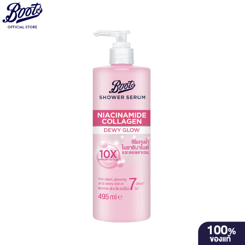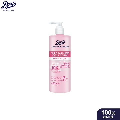 Boots Shower Serum Niacinamide Collagen Dewy Glow 495ml ชาวเวอร์ซีรั่มบำรุงผิวระหว่างอาบน้ำ ที่รวมทั้งการทำความสะอาดและการเติมความชุ่มชื้นไว้ในขั้นตอนเดียว เนื้อสัมผัสนุ่มลื่นให้ฟองกำลังดี ล้างออกง่าย ช่วยลดความรู้สึกผิวแห้งตึงหลังอาบน้ำ พร้อมเผยผิวดูอิ่มน้ำและเปล่งประกายแบบดิวอี้ในทุกวัน ในราคาสุดคุ้ม 109.00 บาท