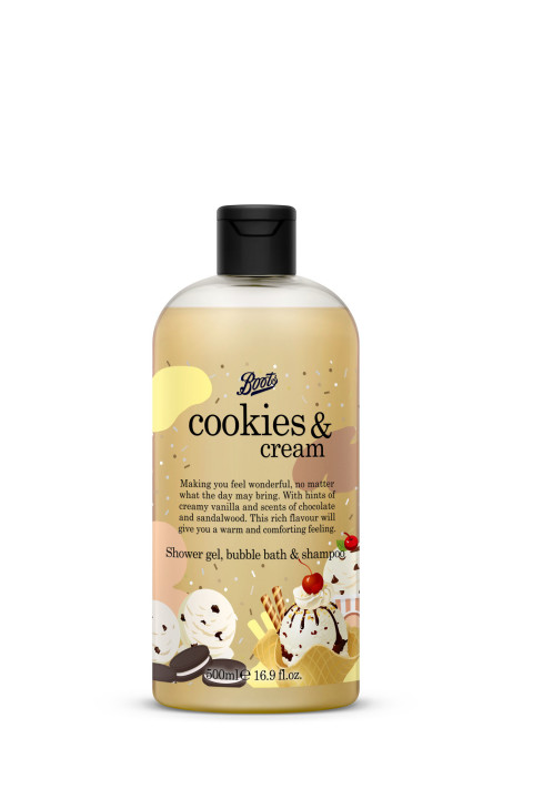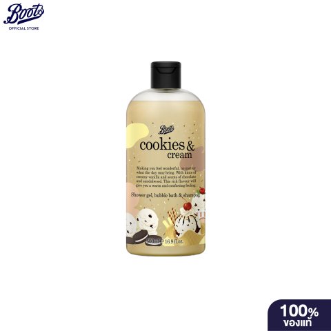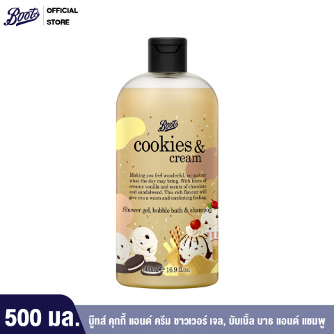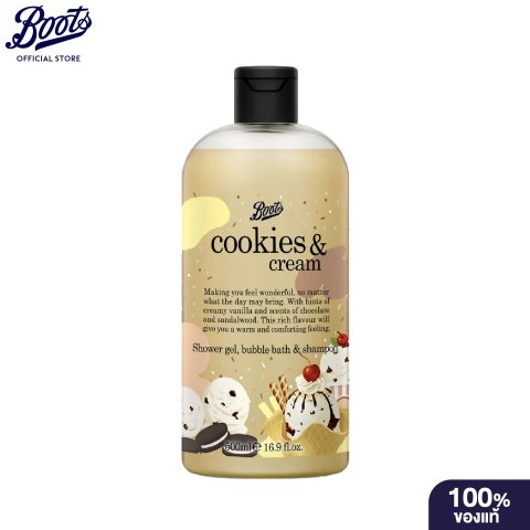 Boots Cookies & Cream Shower Gel Bubble Bath & Shampoo Flavour Collection 500มล. อาบสะอาด หอมละมุน และดูแลครบในขวดเดียว ด้วยผลิตภัณฑ์ 3-in-1 ที่ใช้ได้ทั้งชาวเวอร์เจล บับเบิ้ลบาธ และแชมพู มอบฟองนุ่มสบาย ผสานกลิ่นหอมครีมมี่ของวานิลลา ช็อกโกแลต และแซนดัลวู้ด ให้ความรู้สึกอบอุ่น ผ่อนคลาย เหมือนปรนนิบัติตัวเองทุกวัน