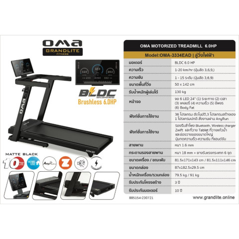 OMA รุ่น OMA-3334EAD ลู่วิ่งไฟฟ้า มอเตอร์ BLDC 6 แรงม้า (Peak 6.0 HP) ราคา 26,946.00 บาท ตัวจบสำหรับสายวิ่งและสายฟิตที่อยากได้ทั้ง “แรง เงียบ ลื่น” พร้อมฟังก์ชันอัจฉริยะครบเครื่อง ใช้งานได้ตั้งแต่วอร์มอัพ เดินเร็ว ไปจนถึงวิ่งจริงจัง รองรับแอปยอดนิยมและมีสิ่งอำนวยความสะดวกเพื่อความสบายระหว่างออกกำลังกาย