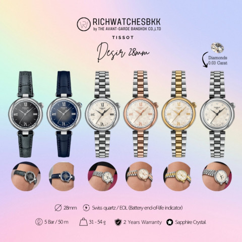 นาฬิกา TISSOT รุ่น Desir 28mm ดีไซน์เรียบหรู ขนาดกำลังพอดีสำหรับข้อมือ ช่วยเสริมลุคให้ดูแพงได้ทั้งวันทำงานและวันพิเศษ มาพร้อมมาตรฐานงานประกอบแบบ Swiss Made ให้ความเที่ยงตรงและดูแลรักษาง่าย เหมาะสำหรับผู้ที่มองหานาฬิกาเรือนเดียวที่ใส่ได้ทุกโอกาส