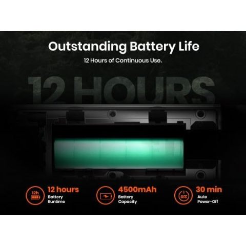 แบตเตอรี่ 4500mAh ใช้งานต่อเนื่องได้สูงสุด 12 ชั่วโมง พร้อมตั้งค่า ปิดอัตโนมัติ 30/60 นาที เพื่อประหยัดพลังงานพร้อมลุยทุกสภาพอากาศ