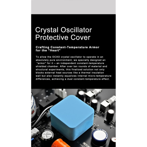 ใช้คริสตัลออสซิลเลเตอร์ OCXO แบบ SC‑Cut ให้ความเสถียรสูงและความแม่นยำระดับอ้างอิง เหมาะกับงานเสียงระดับมืออาชีพ