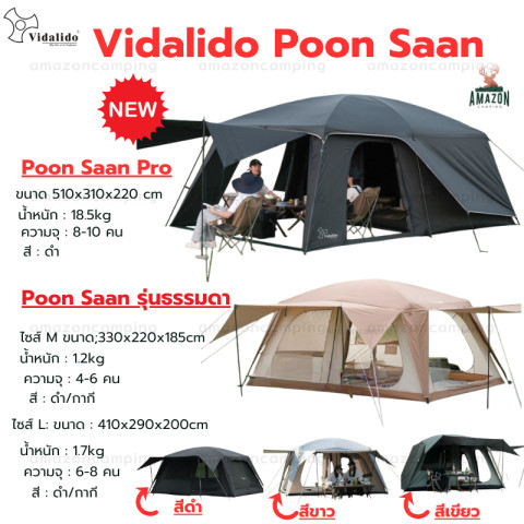 Vidalido Poon Saan รุ่นใหม่ล่าสุด (เสาแบบประกอบ) เต็นท์ครอบครัวทรงกว้างที่ออกแบบมาให้ กันแดด กันน้ำ และระบายอากาศได้ดี กางง่ายด้วยระบบเสาแบบประกอบ ไม่ยุ่งยาก เหมาะสำหรับสายแคมป์ที่ต้องการพื้นที่ใช้สอยจริง ทั้งโซนพักผ่อนและเทอเรสด้านหน้า เปิดรับลมได้หลายทิศทาง ช่วยให้ภายในโปร่งสบายตลอดทริป