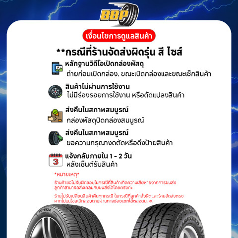 ไม่รับเปลี่ยน/คืนทุกกรณี โดยเฉพาะกรณีลูกค้าสั่งผิดขนาด กรุณาตรวจสอบไซซ์ยางให้ถูกต้องก่อนสั่ง